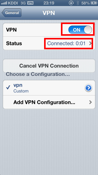 VPN 连接建立后,指示字符串 "Connected" 将显示在 VPN